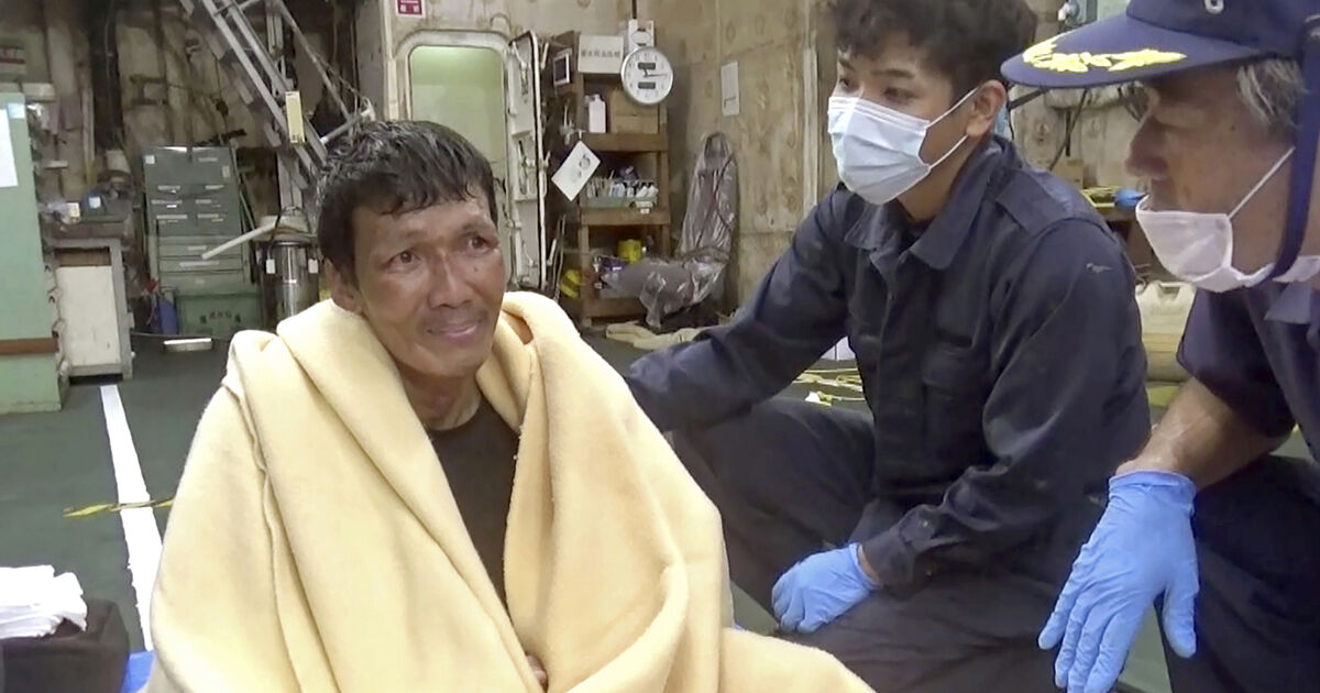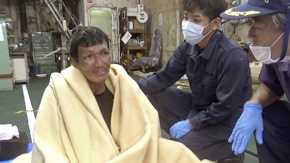“Thank you, thank you very much,” he told rescuers as he was escorted on to a bigger ship, where he sat on a blue tarpaulin, wrapped in blankets and taking a bottle of water.