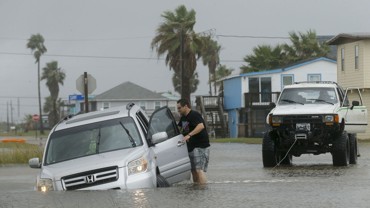 Jeff Williams gets back in his vehicle to try to get it out of the flooded road Monday, Sept. 21, 2020, in Surfside, Texas. A tidal surge hit the island overnight, before Tropical Storm Beta makes landfall. (Godofredo A. Vásquez/Houston Chronicle via AP)