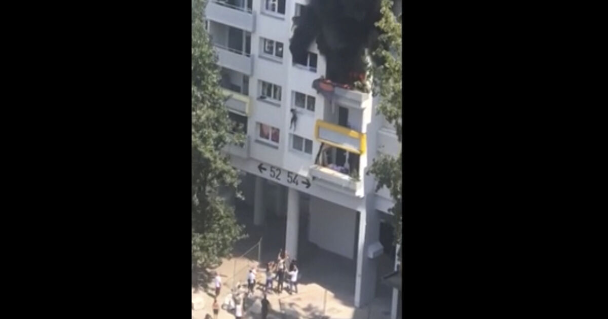 Video of the dramatic rescue showed the younger brother being dropped from at least three storeys up as black smoke billowed from the window and flames engulfed an adjacent balcony.