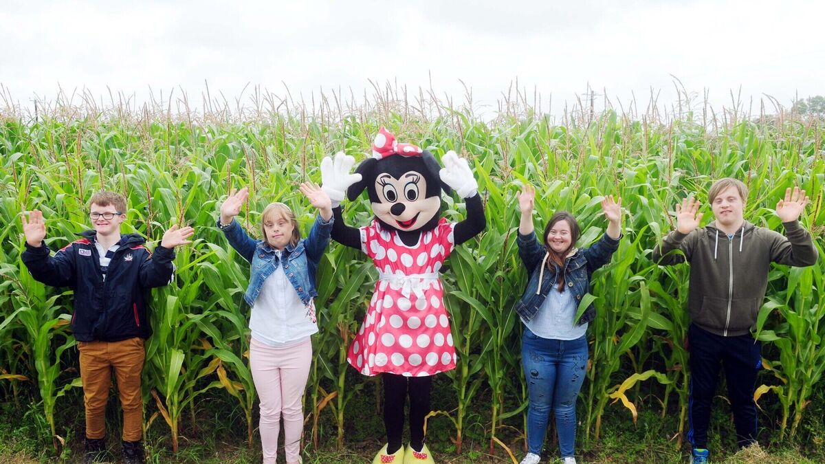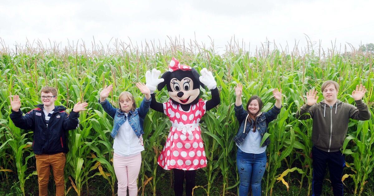 Minnie Mouse with Liam Buckley, Maeve Owens, Mariah Couch, and Ronan Gill in the maize crop at the official opening of Field of Dreams, Down Syndrome Cork, at Curraheen.