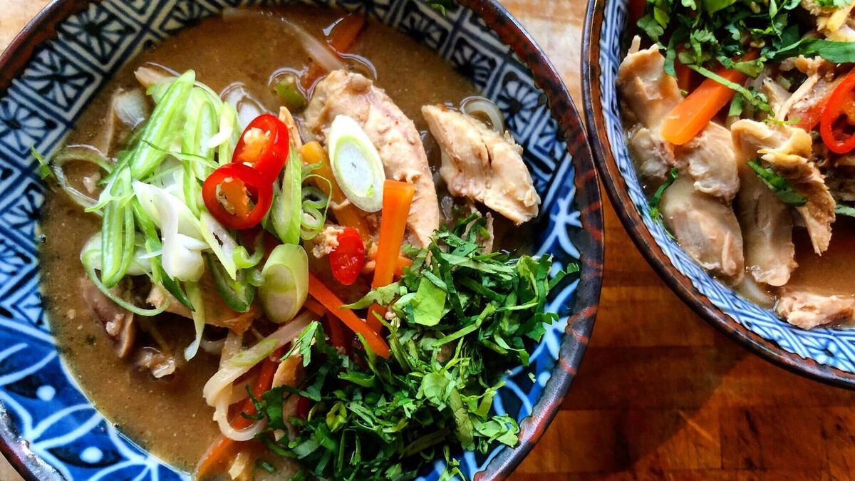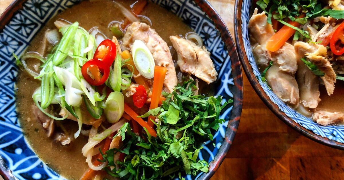 Quick, easy and comforting – there’s nothing quite like it! Into a saucepan, place half the chicken stock and the same amount of water. Add a thumbnail sized piece of grated fresh ginger, 2 cloves of garlic, finely chopped red chili, (to your taste), two tablespoons of soy sauce and the same of white miso paste. Bring to the boil and add your favourite noodles. When the noodles are almost cooked, add the chicken to heat through thoroughly. Spoon into warm bowls and top with sliced scallions, coriander and fresh chili slices.