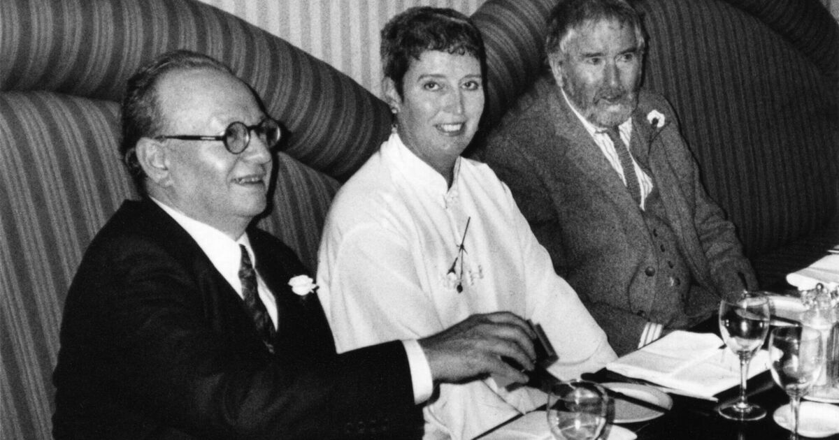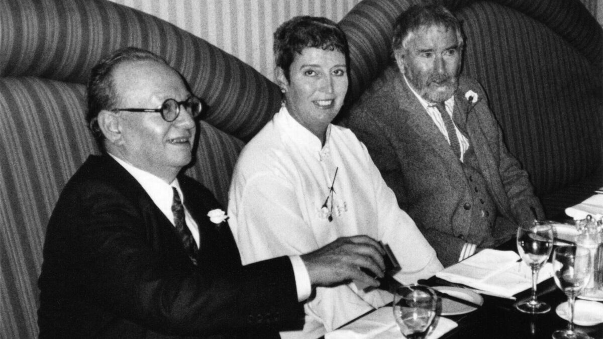 Alannah Hopkin and Aidan Higgins with Best Man Derek Mahon in Buswell's Hotel, Dublin after their wedding on 20 November, 1997.