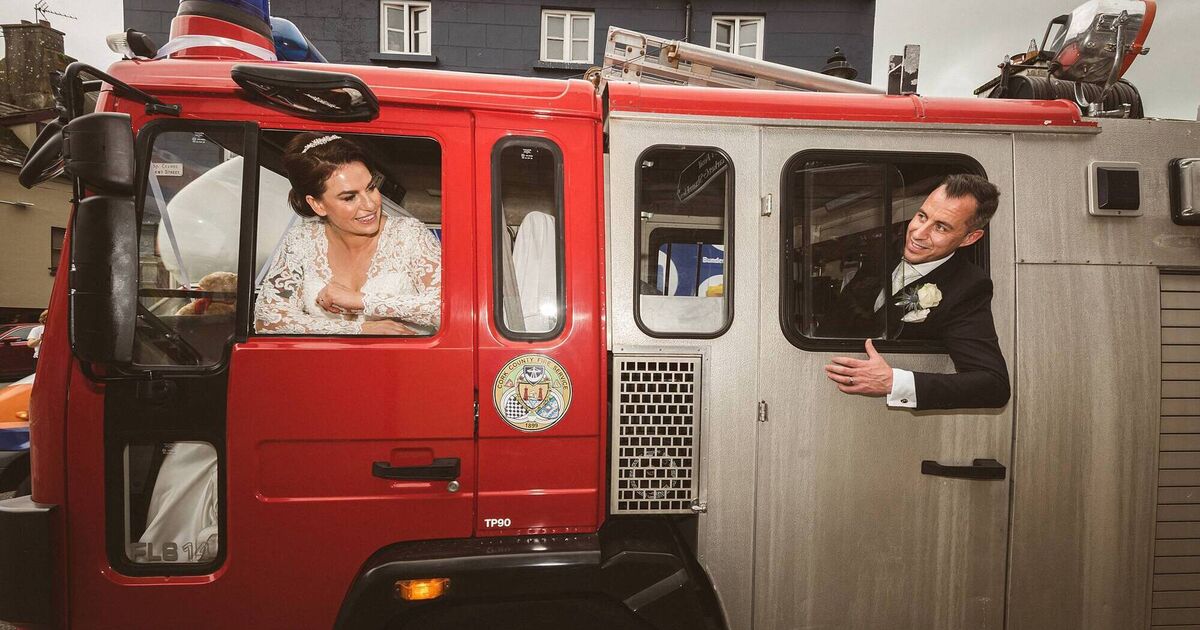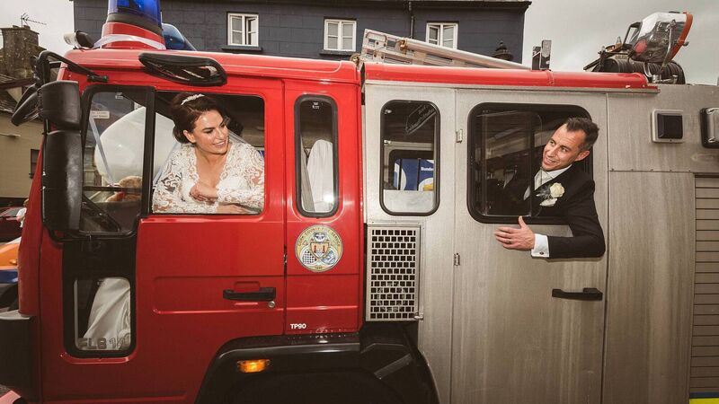 TRAVELLING IN STYLE: Siobhan Heffernan and John O'Regan on their wedding day. Transport was supplied by retired firefighter Ger Buckley, who served in Bandon fire station. Pictures: dermotsullivan.com