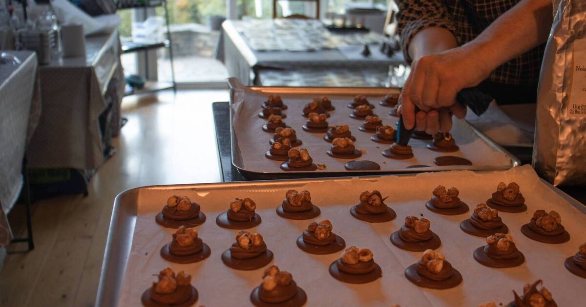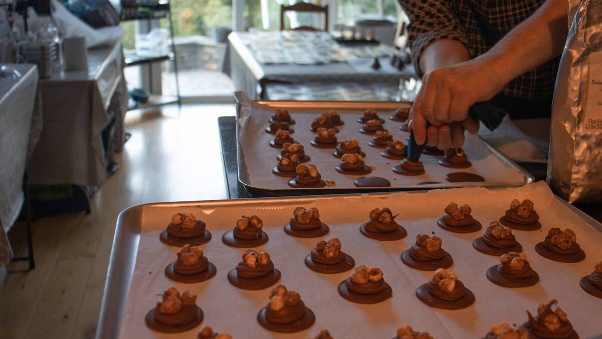 Karen takes me through the process of their Rockies, which are chocolate discs with candied hazelnuts and a covering of ganache. The ganache, which is chocolate and cream, is sometimes swirled with peanut butter and is one of their best sellers.