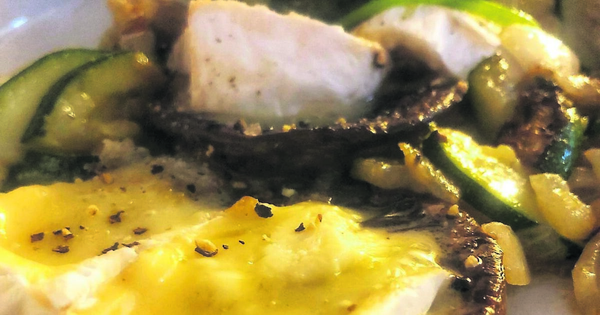Ingredients (serves 4) Butter for cooking Olive oil 2 small onions, peeled and finely chopped 2 cloves garlic, peeled and crushed 2 courgettes, chopped Sea salt and freshly ground black pepper 8 large flat mushrooms, wiped and stalks trimmed 150g Brie de Meaux, in slices 250g baby spinach leaves, rinsed and spin dried Method Melt butter with a splash of oil in a large non stick pan.