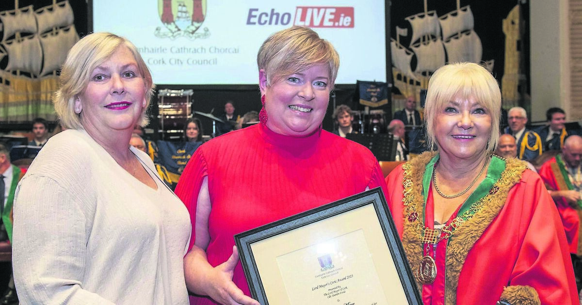 Elmarie Mawe receiving a Civic Award from the Lord Mayor of Cork, Cllr Deirdre Forde, and Ann Doherty, Chief Executive, Cork City Council, in recognition of her outstanding contribution to the arts last month