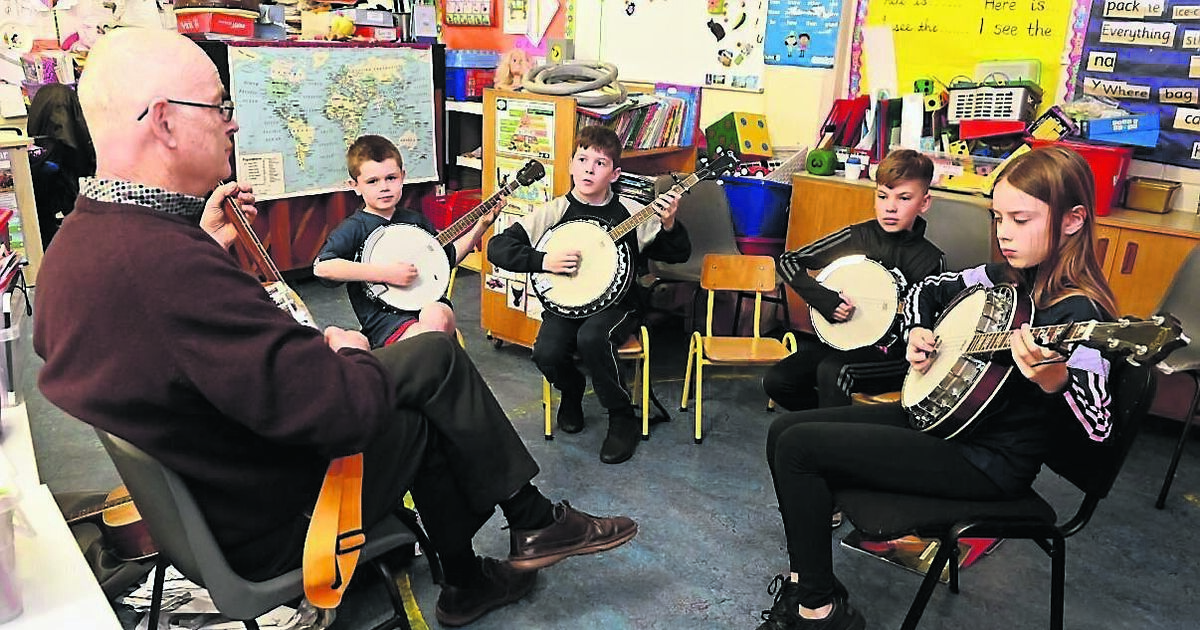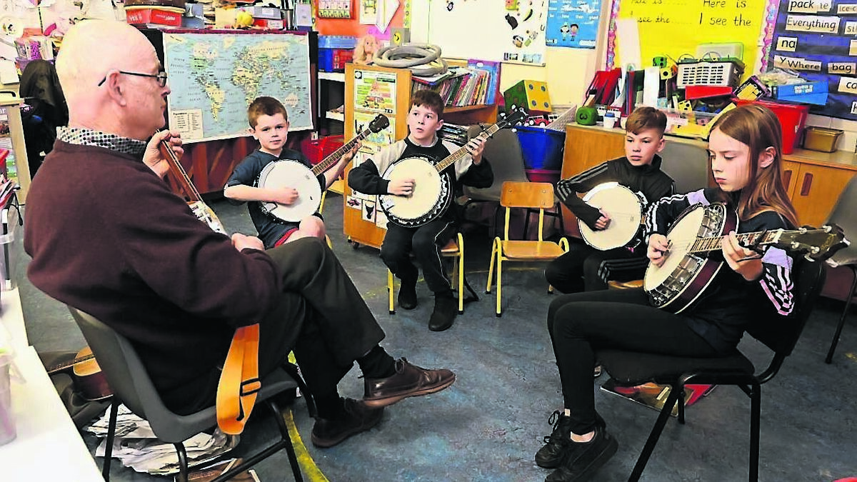 Banjo teacher Mick Hickey with Conor McKeon, Eoin Ronayne, Aaron Harrington and Emily Troy of Imokilly-Midleton Comhaltas during rehearsals at St Bridget’s School, Midleton