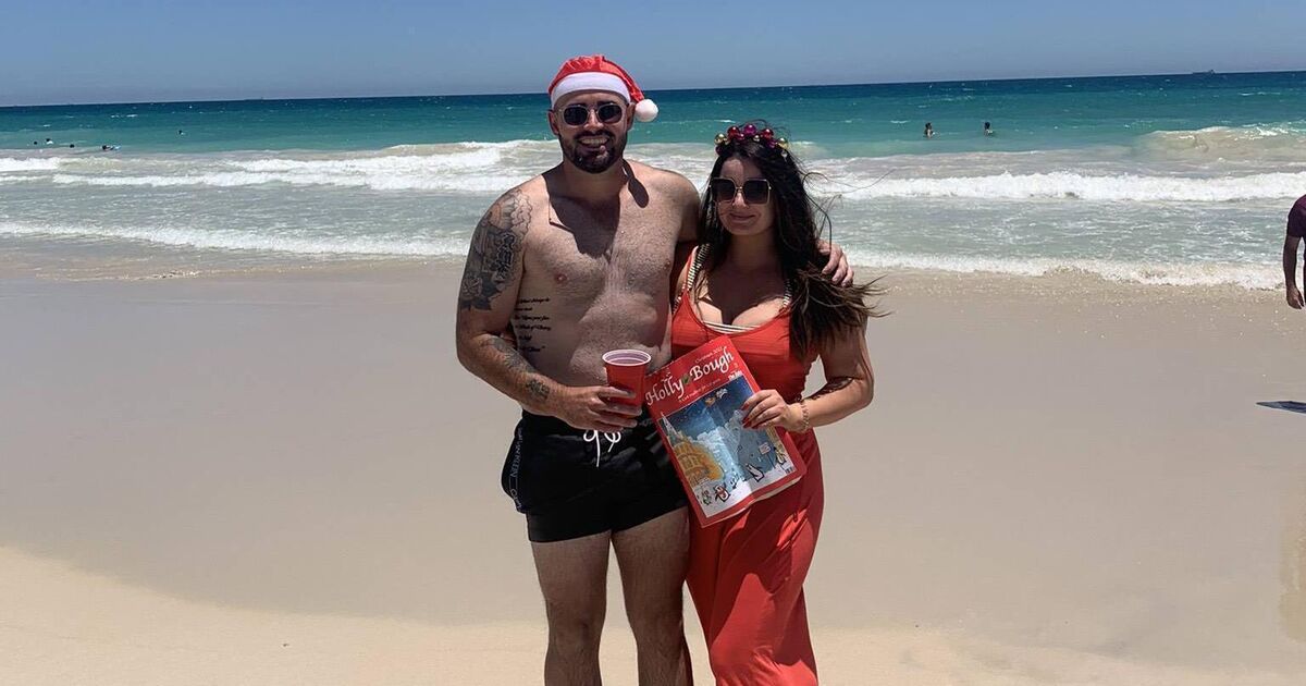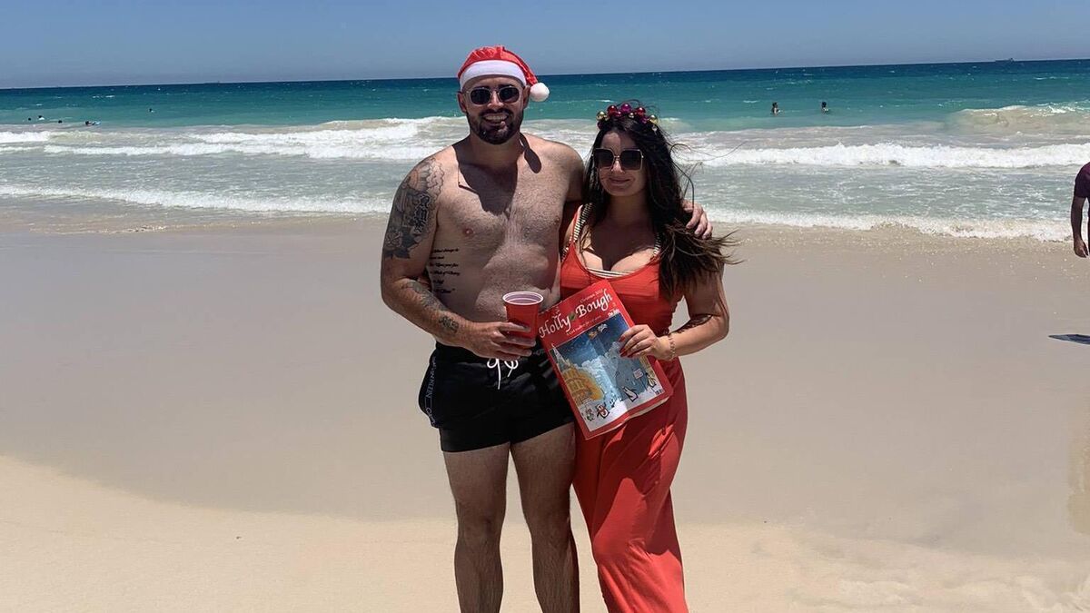 Laura Bridgeman and Ian Ricken on the beach at Christmas with the Holly Bough.