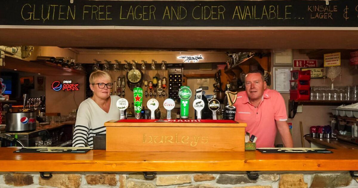 Lindsay and Lester Hurley behind the bar at Hurley’s in Ballinspittle. “You go through a lot of villages and there’s a lot of places closed,” said Lester, “whereas everything is open here.” Pictures: Noel Sweeney