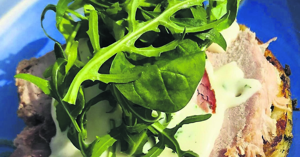 Serve the cakes topped with hot or cold sliced cooked ham and a drizzle of sauce. Top with salad leaves to finish.