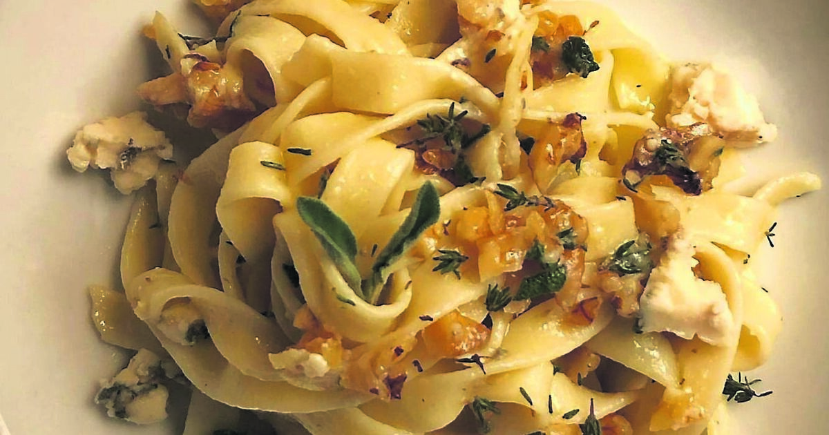 Ingredients (serves 4 500g tagliatelle nests Extra virgin olive oil 2 cloves garlic, peeled and crushed 150g walnut pieces, chopped 2 tsp fresh thyme leaves Few sage leaves, finely shredded 150g blue cheese, crumbled, plus extra to taste for finishing Method Cook tagliatelle in a large pan of boiling slightly salted water with a dash of olive oil added, till its just al dente.