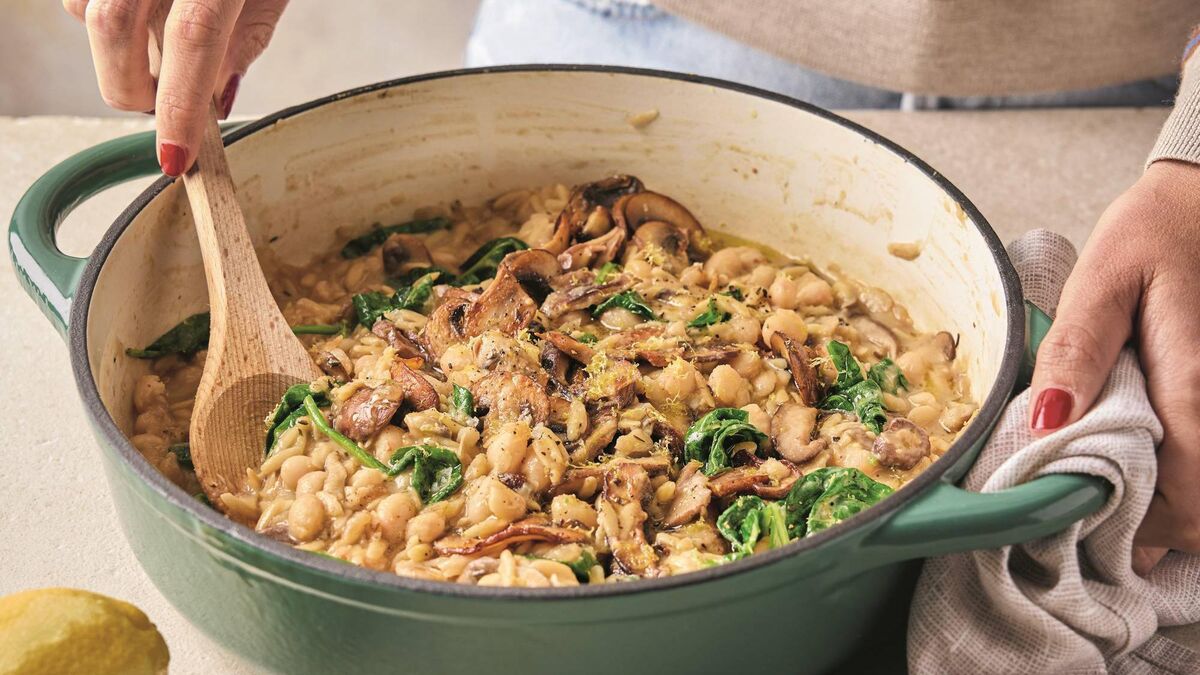 “When I want something cosy and comforting but super easy, with almost no washing up, this creamy, zesty white bean and mushroom orzo is my go-to. Everything comes together in one pan, making it the perfect fuss-free meal for busy days,” says Ella Mills.