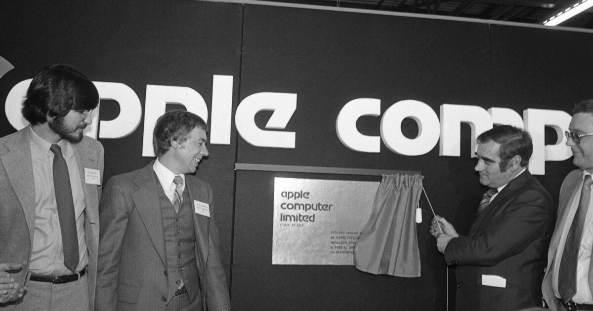 Gene Fitzgerald unveiling a plaque to officially open the new Apple Computer plant at Hollyhill in November 1980. Included in the picture are Steve Jobs, Mike Markkula and Alec Wrafter. Picture: Irish Examiner