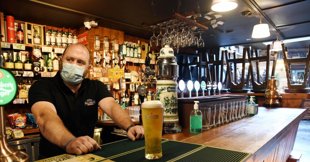 Steven Hackett, owner, Nana's Bar, Douglas Street, Cork, after filling a pint before he closes again for Level 3.