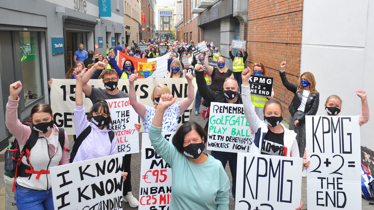 A sit-in protest in the Debenhams , St Patrick's Street, Cork City store, by eight former workers, ended on Thursday. Valerie Conlon, Mandate shop steward was among the the eight Mandate workers who took part in the sit-in protest, pictured with supporters on Maylor Street after they ended the sit-in action.