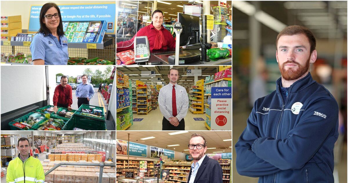 Clockwise: Store manager of Aldi Cliona Wallace; checkout operator at Quish's SuperValu Hajnajka Roscas; customer assistant at Tesco Superstore in Wilton Jason Dunphy, owner of Centra in Rochestown Terry Murphy; Logistics Manager of Lidl's Charleville warehouse Donal Egan; SuperValu online driver Dave Garrett and store owner Cormac Quish; and Line manager at Tesco Superstore in Wilton Richard Kenneally.