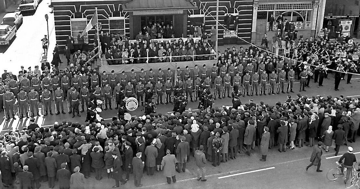 St. Finbarr's Pipe Band pass the reviewing stand at the St. Patricks Day parade in 1968.