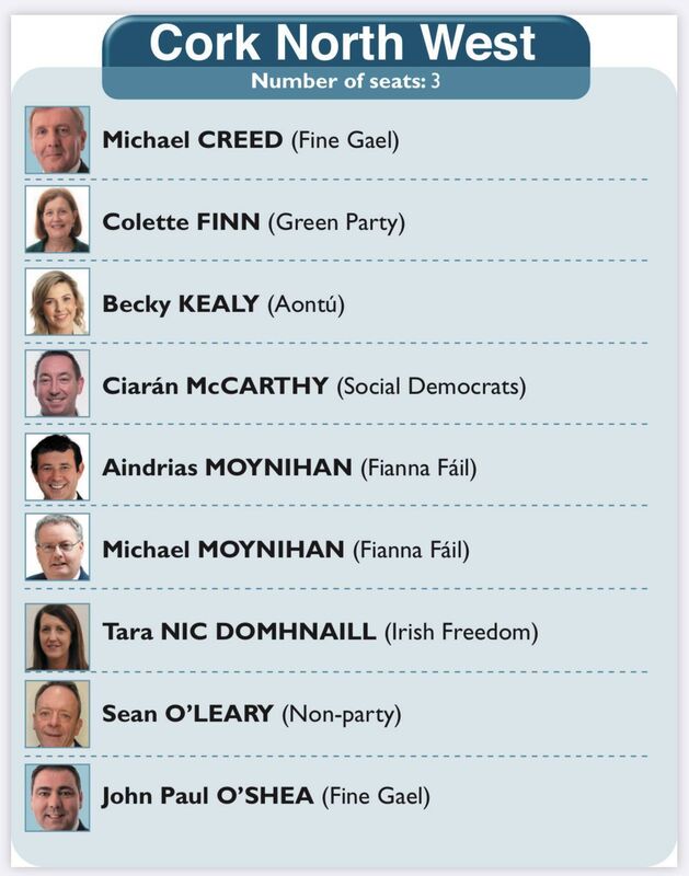 The three incumbent TDS, Fianna Fáil’s Aindrias Moynihan, party colleague Michael Moynihan and Fine Gael’s Michael Creed are expected to retain their seats.