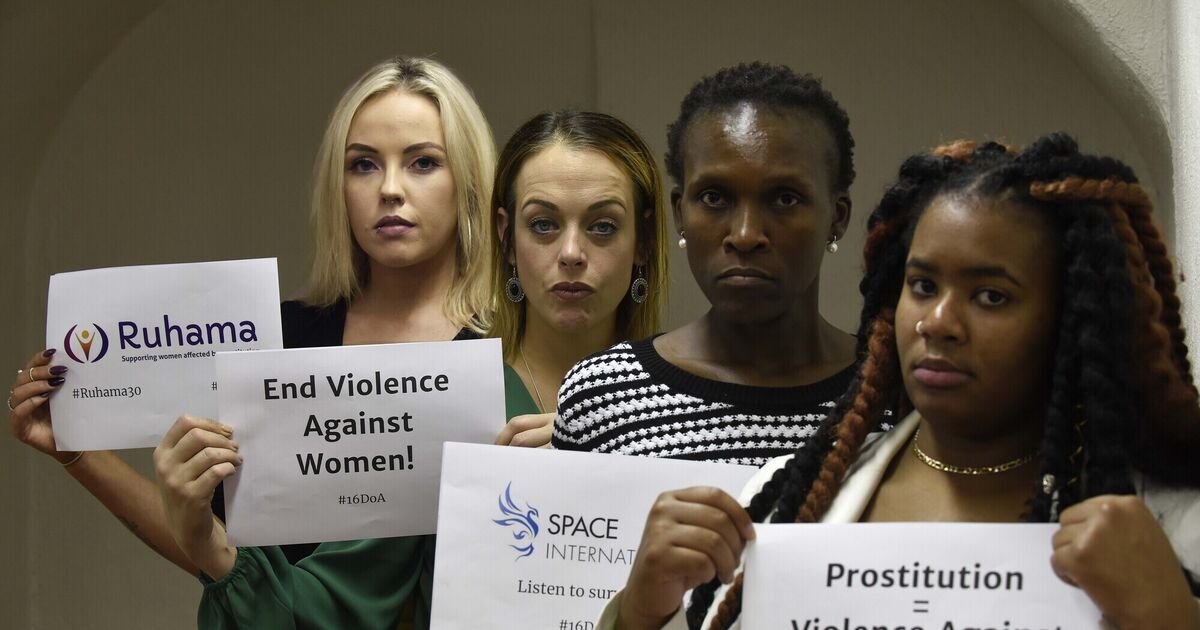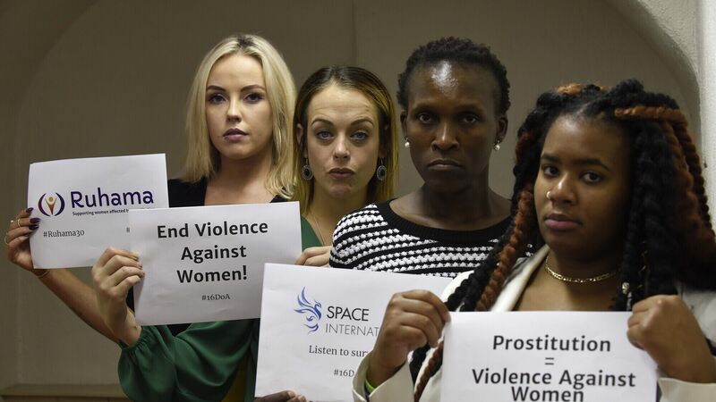 Nikki Bell, Massachusetts, Melanie Thompson, New York and Mickey Meji, Cape Town, survivors of the sex trade with Amanda Keane, left, Ruhama, gathered ahead of a conference organised by Ruhama to call out ‘The Sexual Violence of Prostitution and Pornography’, marking the global 16 Days of Activism to End Gender Based Violence.