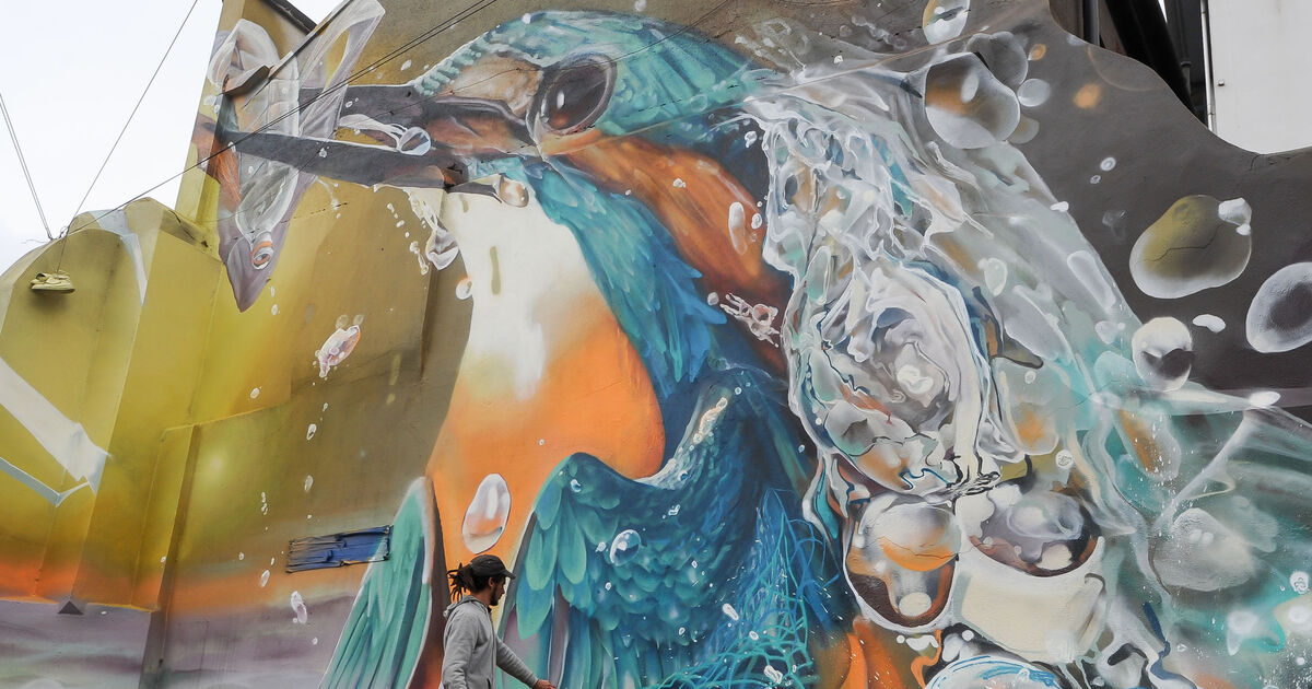 Artist Curtis Hylton working on the mural near Paul St Car Park on Lavitt’s Quay, Cork, in association with Cork City Council, Blackrock Castle Observatory, and The Walls Project.