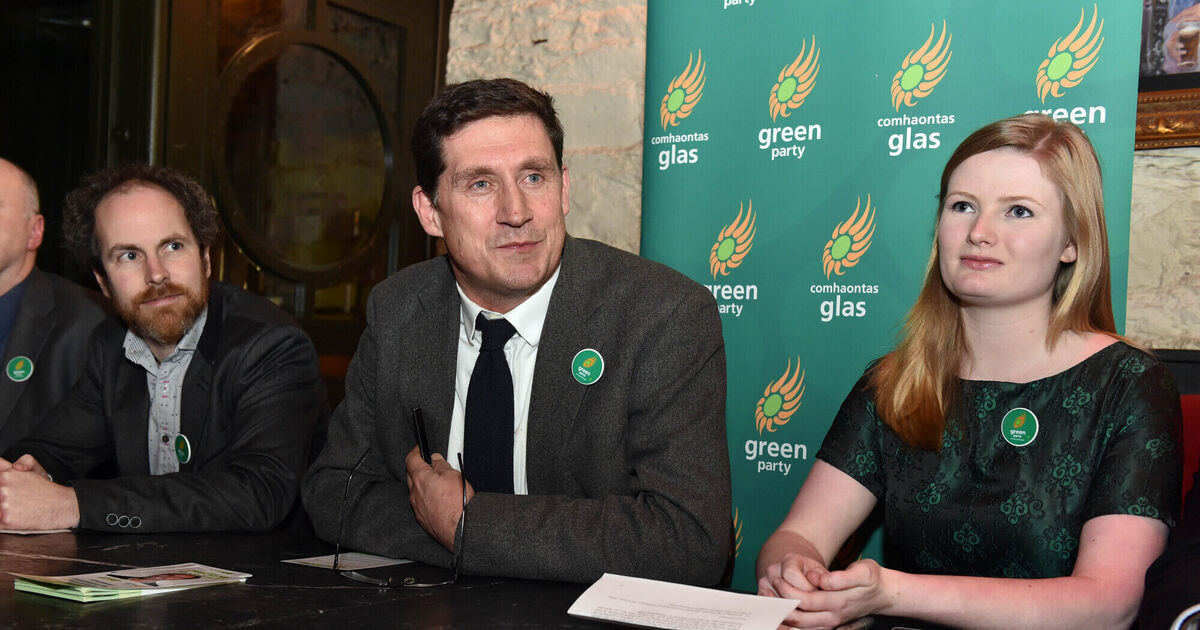 Green Party leader Eamonn Ryan with newly elected councillors Oliver Moran and Lorna Bogue.