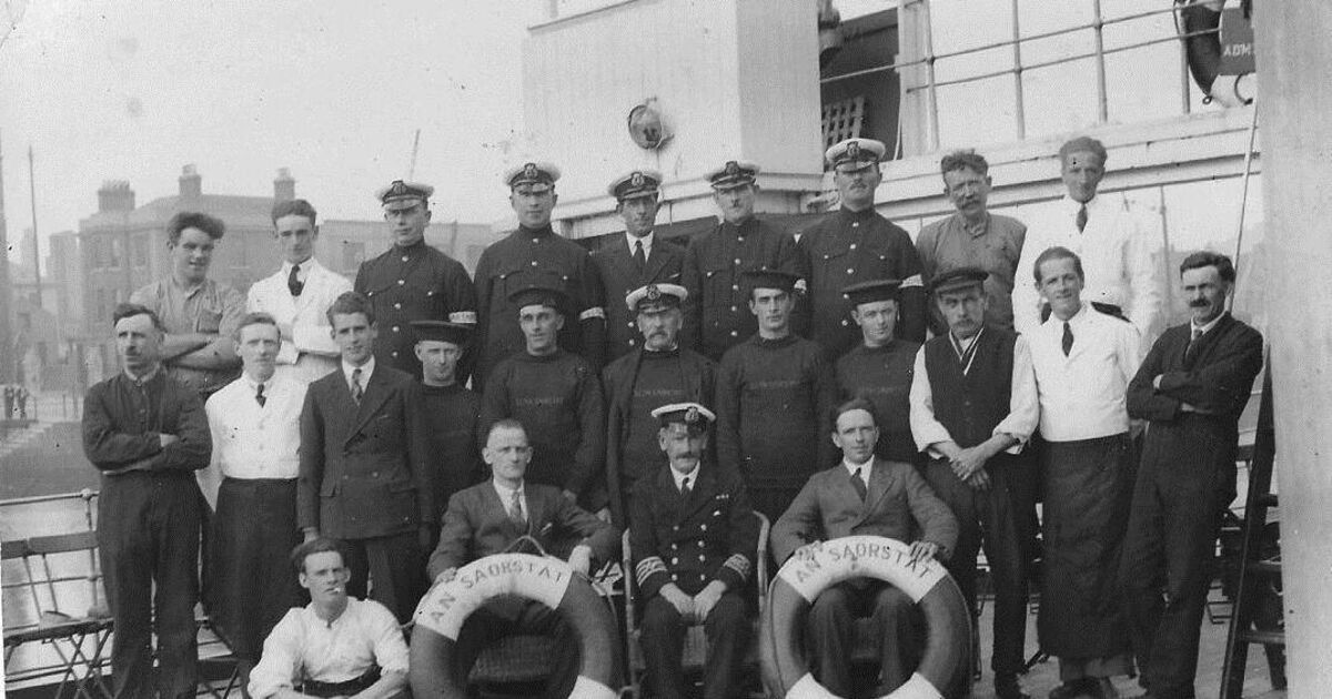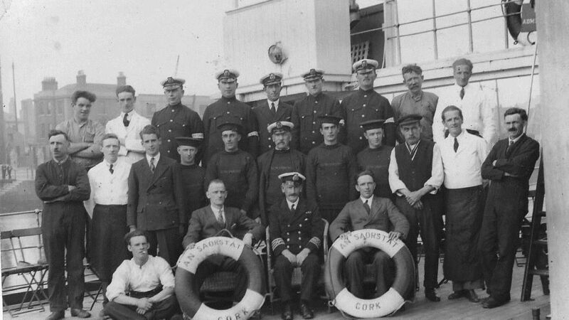 Likely a ship’s crew, with lifebelts bearing the name, An Saorstat Cork’