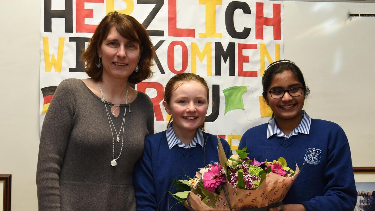 German Ambassador Deike Potzel pictured with Mount Mercy pupils Aoife Feehely and Angel Metro on a visit to the school this week. Pic: Larry Cummins.