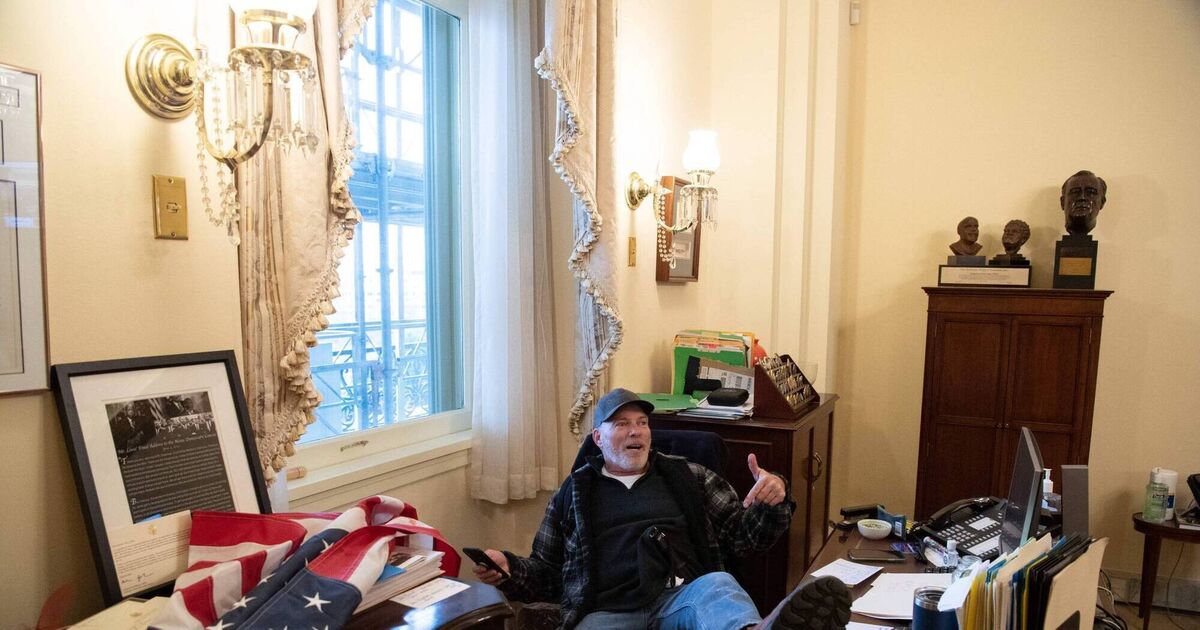 A supporter of US President Donald Trump sits inside the office of US Speaker of the House Nancy Pelosi as he protest inside the US Capitol in Washington, DC, January 6, 2021. - Demonstrators breeched security and entered the Capitol as Congress debated the a 2020 presidential election Electoral Vote Certification. (Photo by SAUL LOEB / AFP) (Photo by SAUL LOEB/AFP via Getty Images)