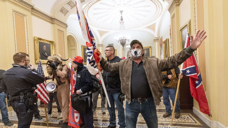 Supporters of President Donald Trump are confronted by US Capitol Police officers outside the Senate Chamber inside the Capitol in Washington.