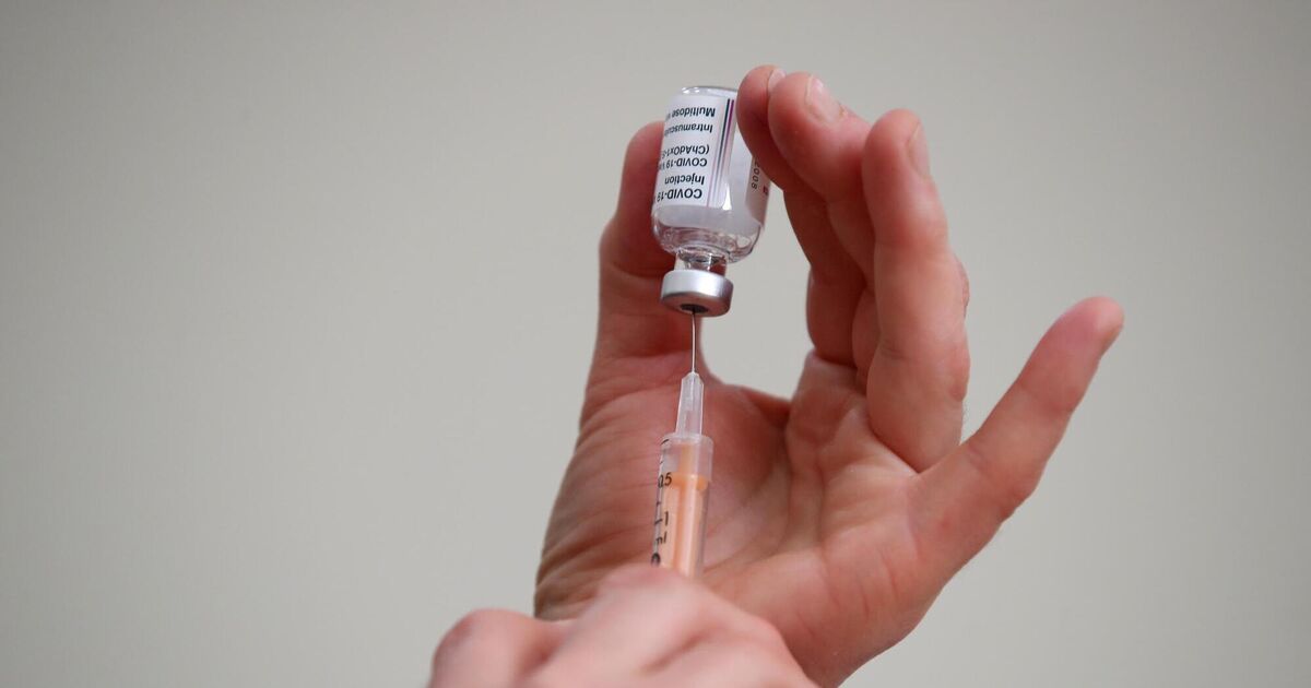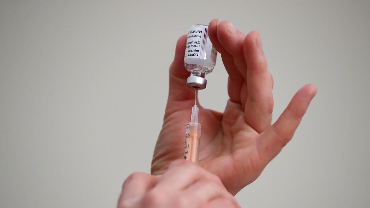 A healthcare worker fills a syringe with a dose of the Oxford/AstraZeneca coronavirus vaccine.