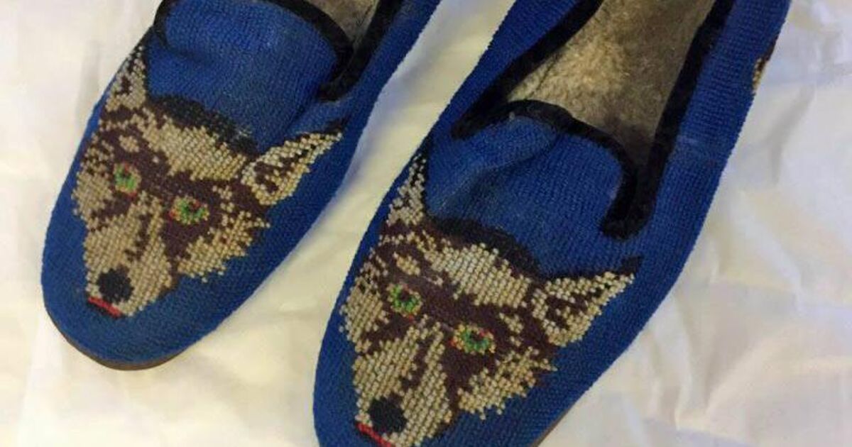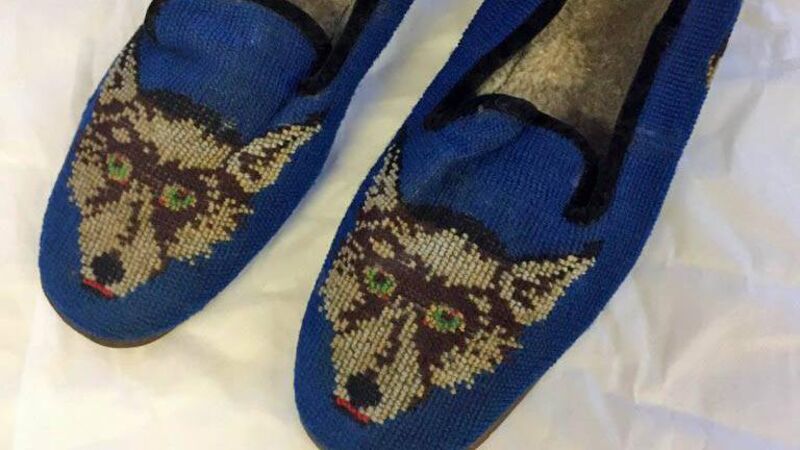 The item in question is a pair of cobalt blue slippers each embroidered with a wolf's head, owned by none other than Michael Collins.