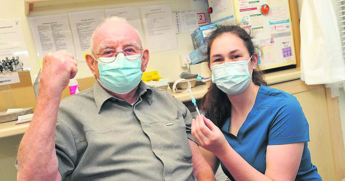 Daniel Sheehan, 87, from Commons Road, receives his first vaccination dose from nurse Sarah O’Donovan. The Government launched a staunch defence of progress in the vaccination rollout amid increasing criticism from the Opposition.