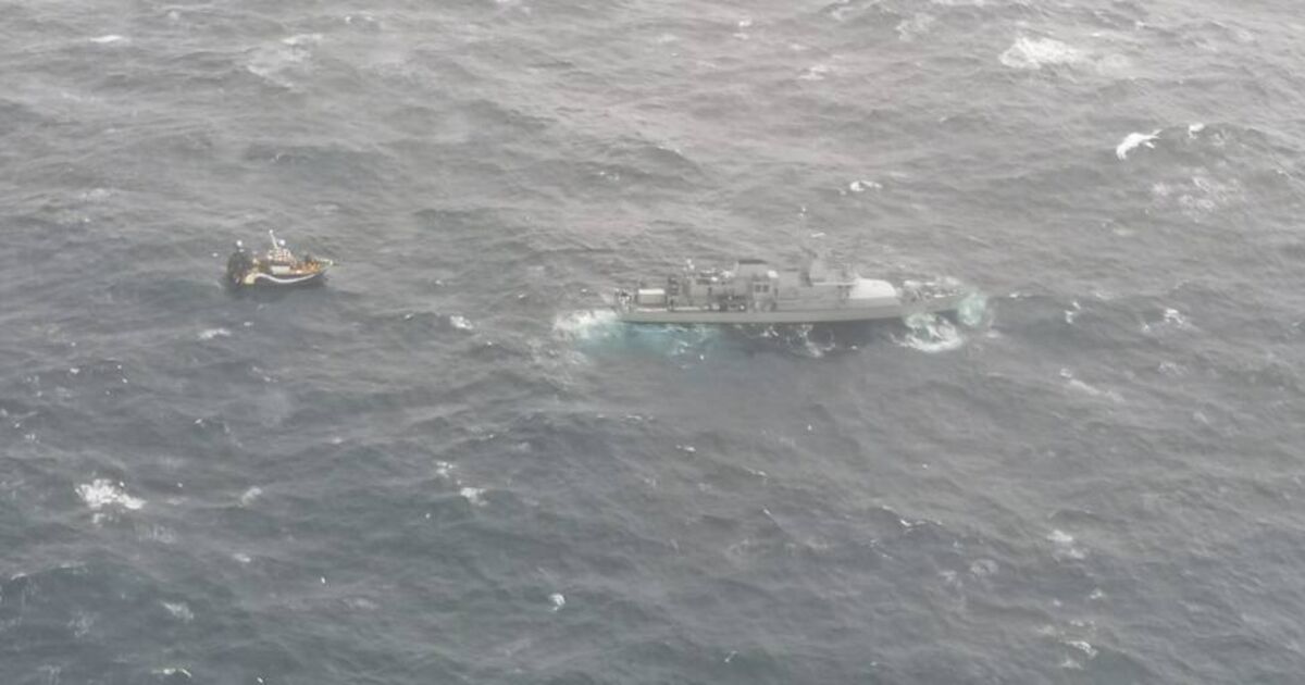 Incident Update 4: Fishing Vessel ELLIE ADHAMH began taking water while under tow by @naval_service Naval ship LE George Bernard Shaw, IRCG Helicopter R117 winched the crew onboard and brought safety to Cork, footage of crew from R115 earlier today in rough Sea conditions. pic.twitter.com/qkY8sUxckR