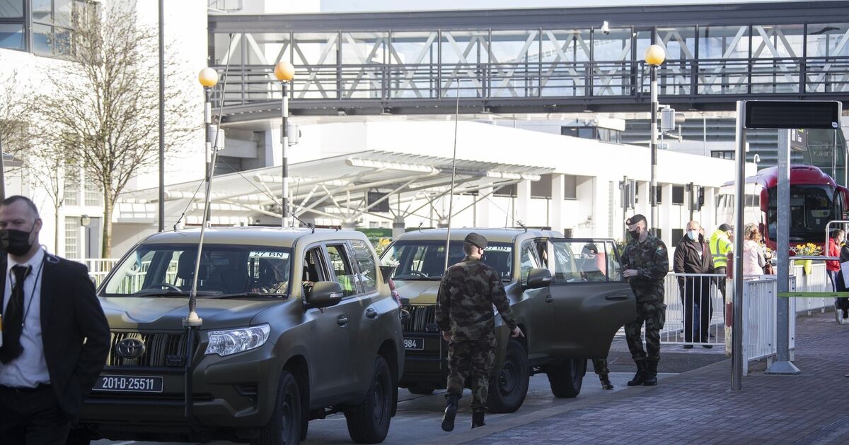 Defence Forces personnel awaiting flights to escort passengers to their mandatory hotel quarantine at Dublin Airport.