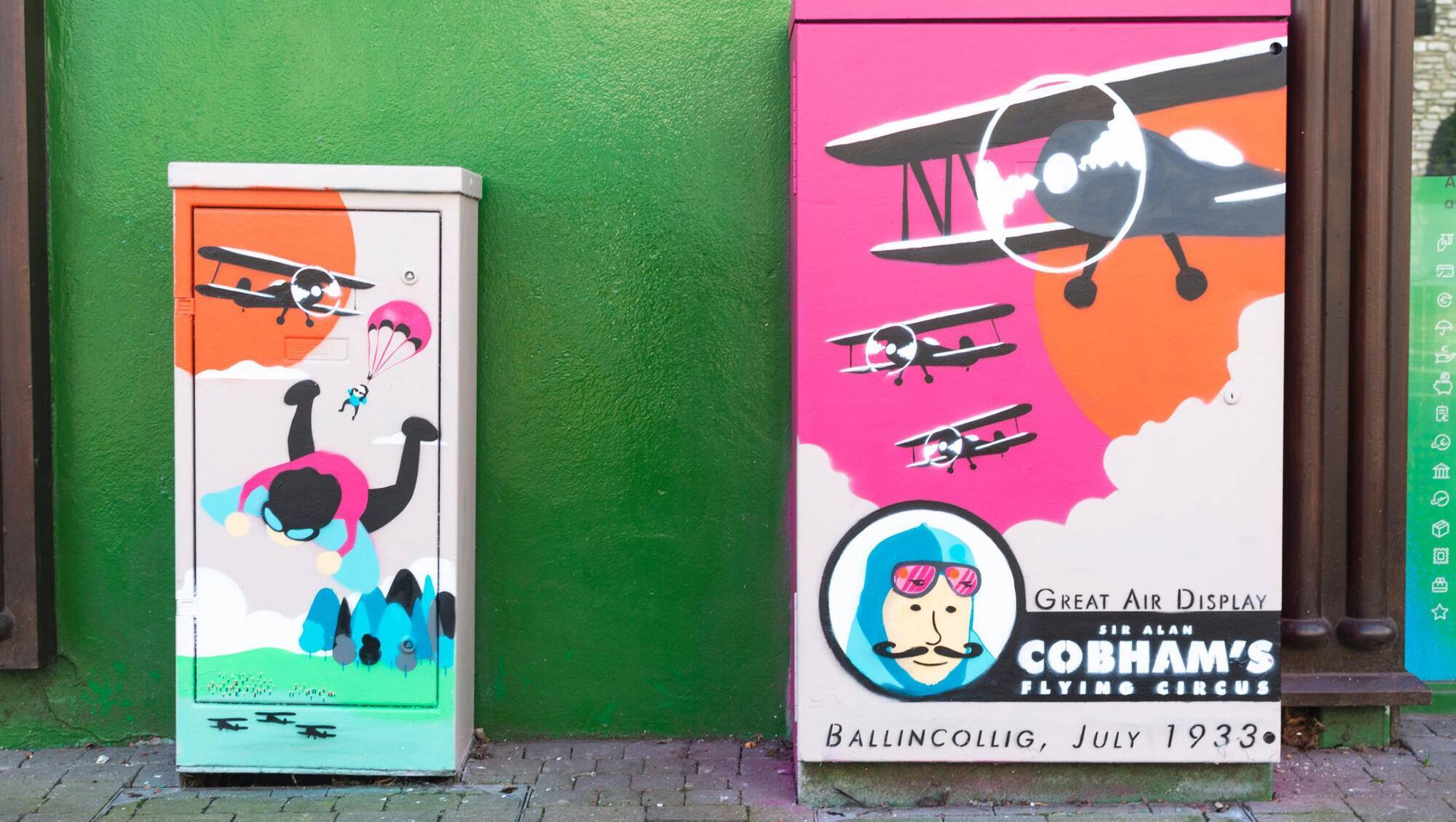 The latest electrical box paintings by Kevin O'Brien are inspired by by Sir Alan Cobham's Flying Circus that came to Ballincollig in the 1930s. Picture credit: Kevin O'Brien.