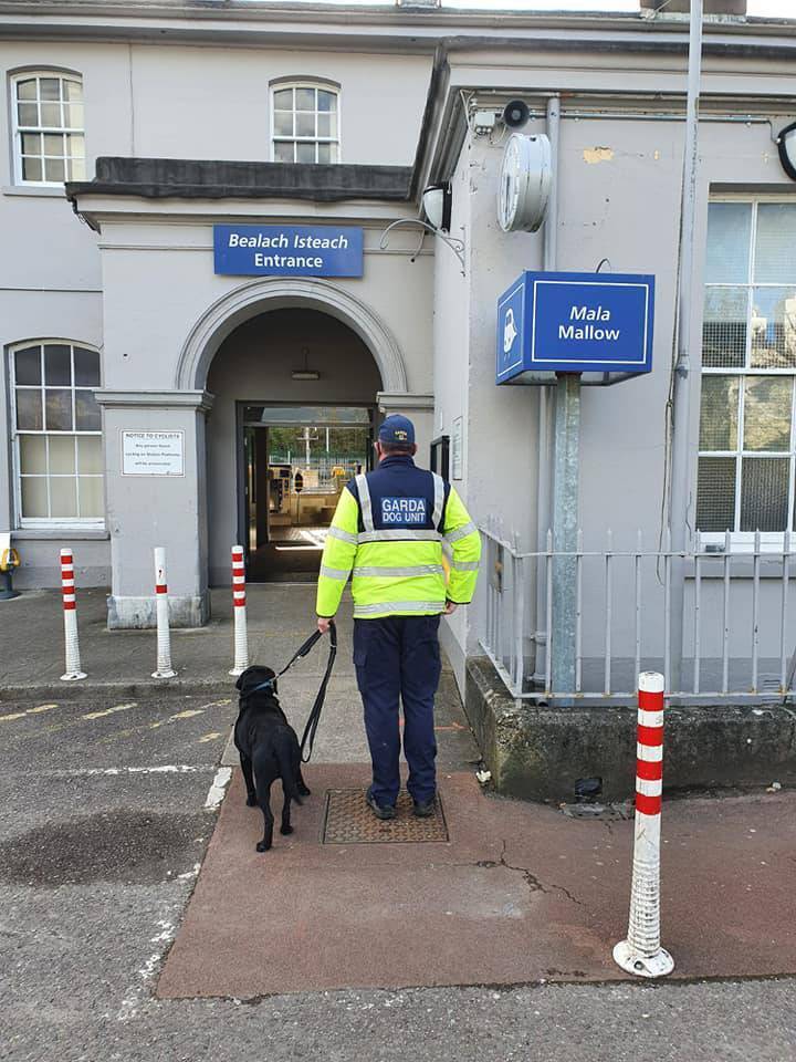 The Garda Dog Unit was on patrol at Mallow Train Station in a joint operation with the Mallow Drugs Unit. Source: Garda Síochána, Cork Kerry and Limerick Southern Region Facebook page.