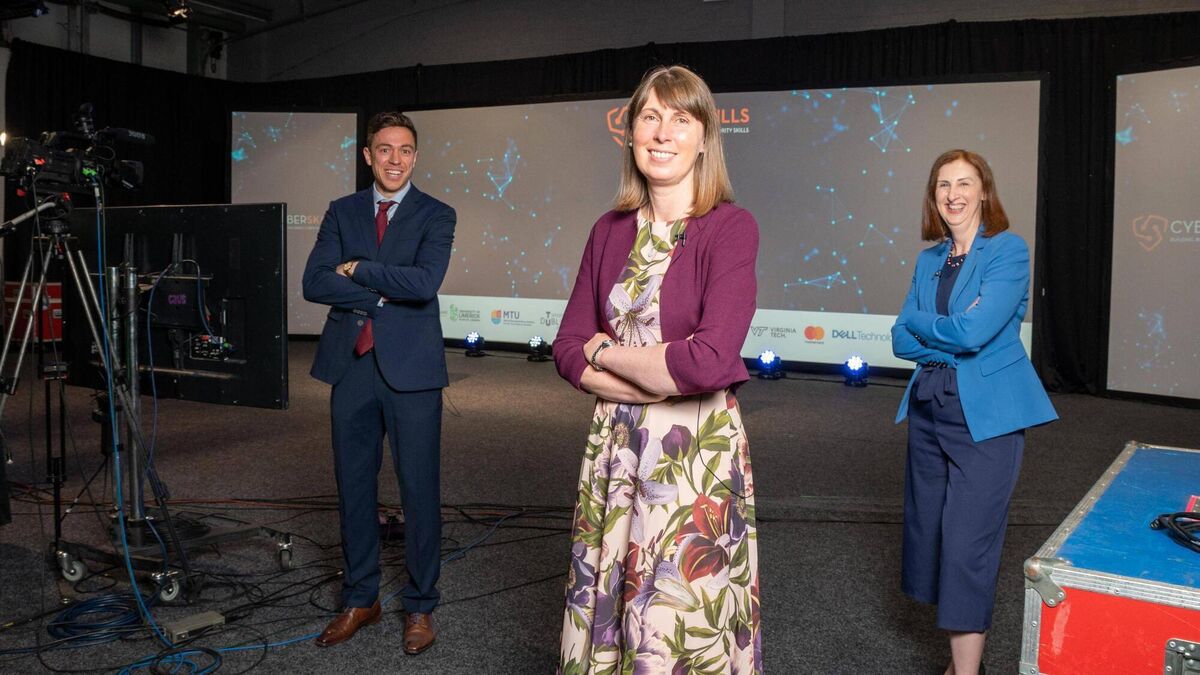 Dr Eoin Byrne, Cyber Ireland Cluster Manager; Prof. Donna O’Shea, Chair of Cyber Security at MTU and Jacqueline Kehoe, Cyber Skills project manager MTU pictured in VE Studios Cork.