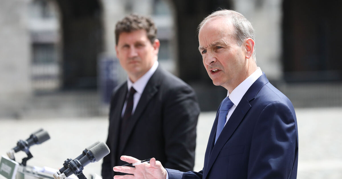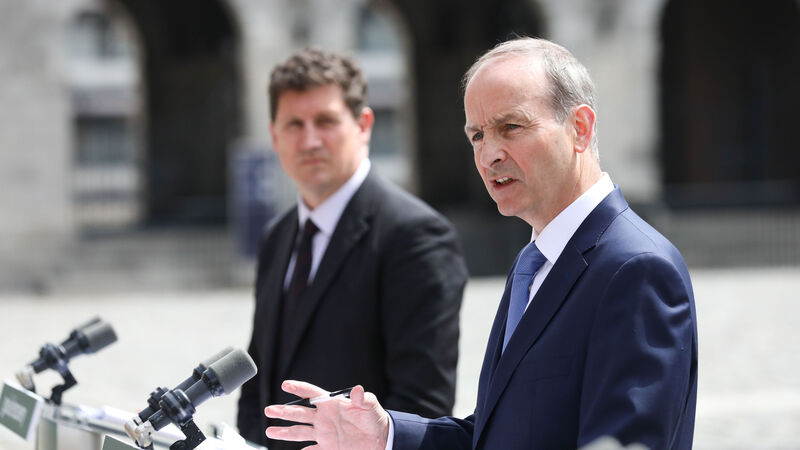 Pictured outside Dublin Castle today are Taoiseach Micheál Martin and Minister for the Environment, Climate and Communications, Eamon Ryan, as they launch the Economic Recovery Plan. Photograph: Sasko Lazarov / RollingNews.ie