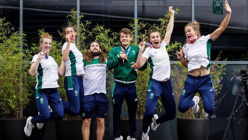 Team Ireland's Emily Hegarty, Fiona Murtagh, Paul O'Donovan, Fintan McCarthy, Aifric Keogh and Eimear Lambe return home with their medals from Tokyo