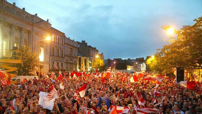 Some of the crowds that turned out to welcome home the victorious Cork team home on September 13, 2004. Credit: INPHO/Morgan Treacy