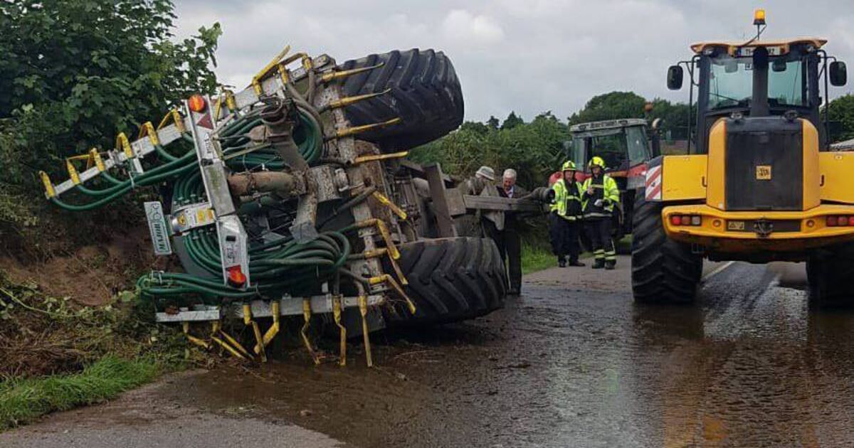 Crews from Ballyvolane and @corkcountyfire Mallow are currently dealing with an overturned slurry tank trailer in Carrignavar near the GAA Grounds.