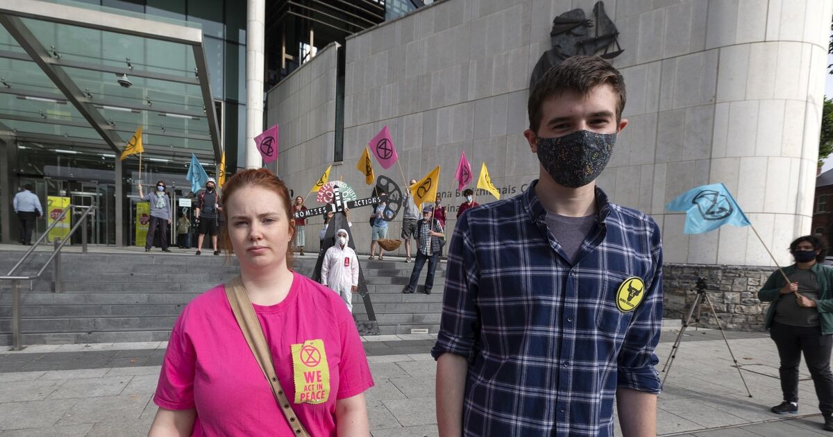 Rebellion activists, Orla Murphy (20), of Ballinacarrig, Whitechurch, Co. Cork and Zachary Lumley, of South Lodge, Ballinlough, Cork City, leaving Dublin District Court after a previous appearance. They are charged with criminal damage at the Department of Foreign Affairs, Dublin, and will go on trial in February 2022. PIC: Collins Courts