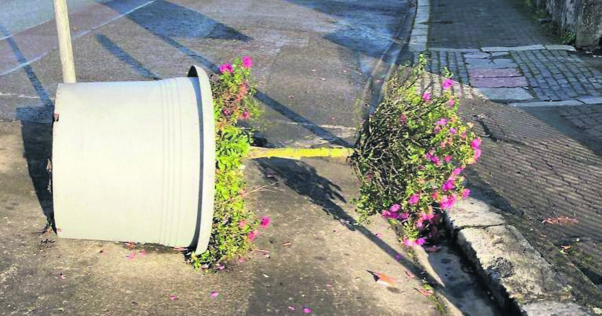 Two large flower pots worth approximately €500 each were tipped over and broken in Brian Boru Square and a large pot was turned over in the Meadows.