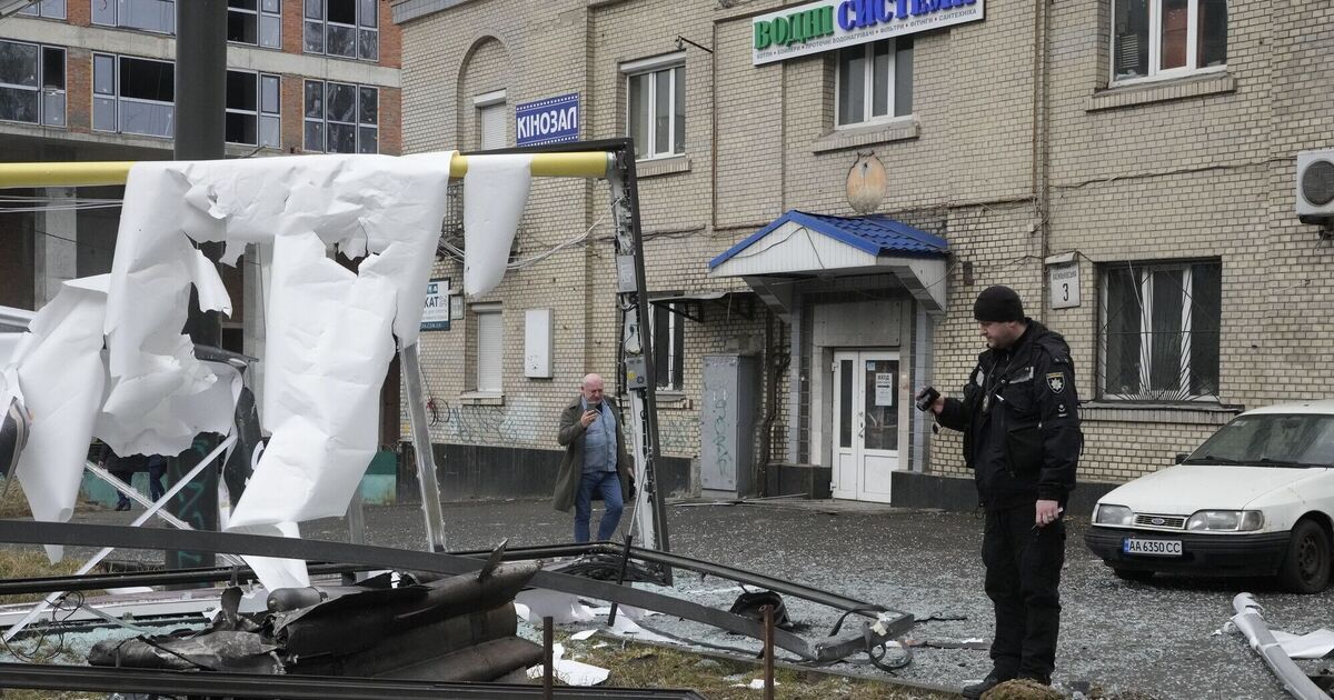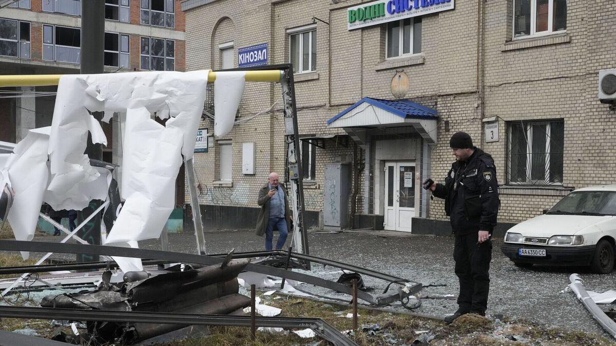 A police officer takes a photo of the consequences of Russian shelling in Kyiv, Ukraine, Thursday, Feb. 24, 2022. Russian troops have launched their anticipated attack on Ukraine. Big explosions were heard before dawn in Kyiv, Kharkiv and Odesa as world leaders decried the start of an Russian invasion that could cause massive casualties and topple Ukraine's democratically elected government. (AP Photo/Efrem Lukatsky)