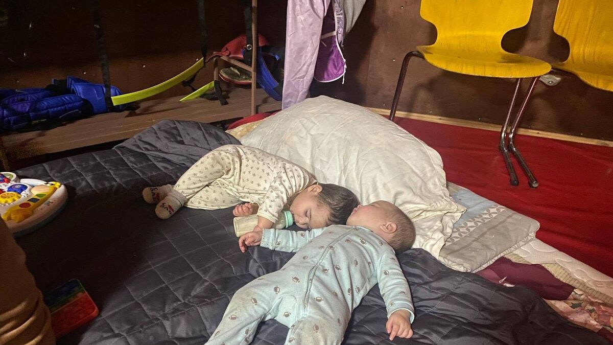 Two babies from "Father's House" in Kyiv who were taken from the home and are now seeking refuge in Poland. Picture taken on Polish border care of the Father's House charity