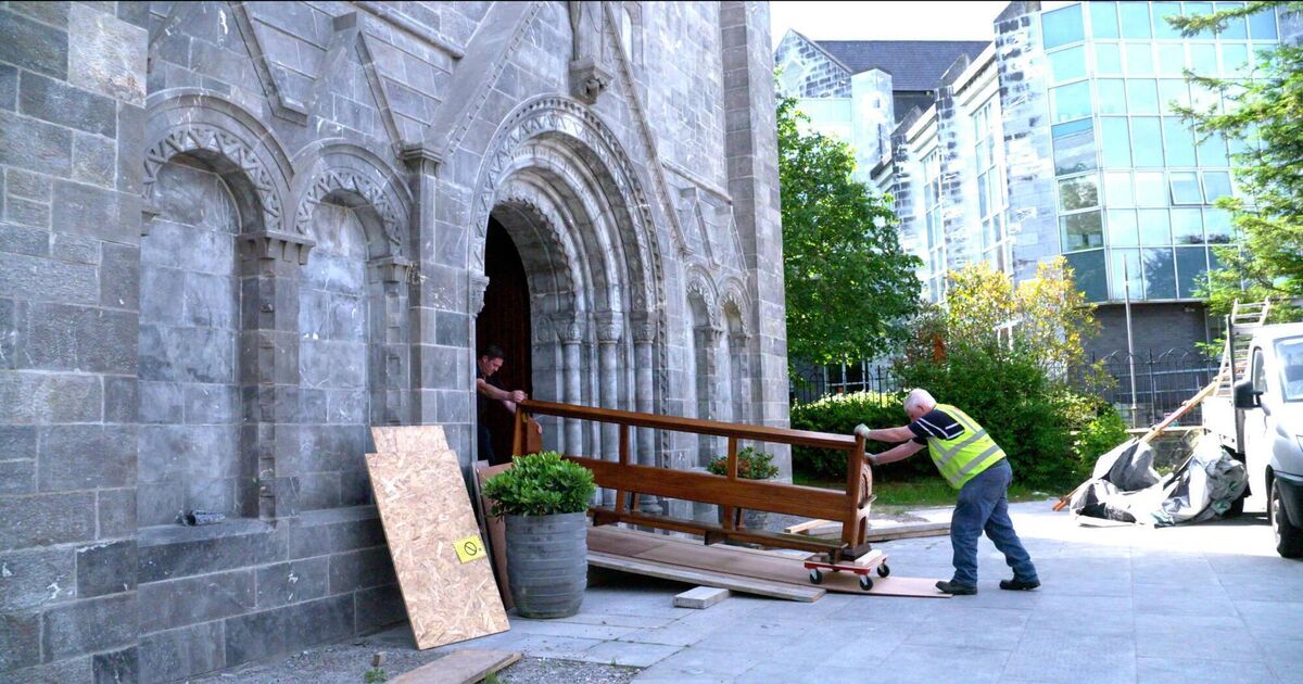 Workers bring in the newly restored pews to the Honan Chapel. Picture: Stephen Bean/UCC.