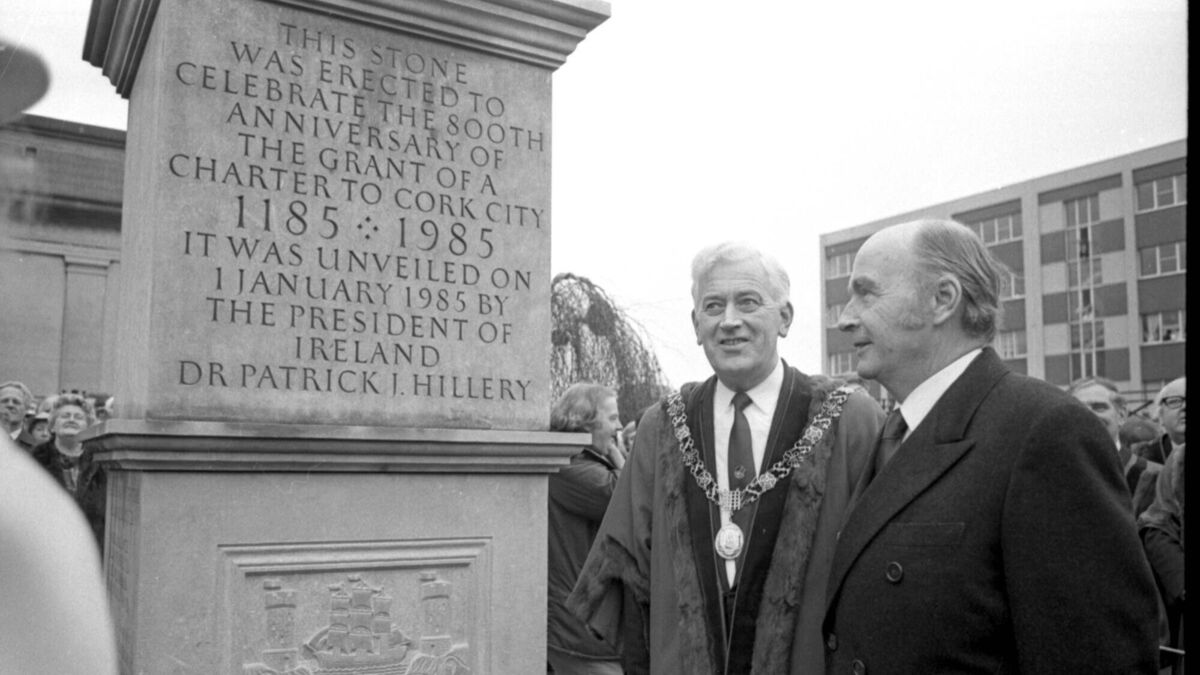Lord Mayor of Cork, Ald Liam Burke, pictured with President, Dr Patrick Hillery, after the unveiling of the memorial stone to celebrate Cork 800. Picture: Eddie O'Hare