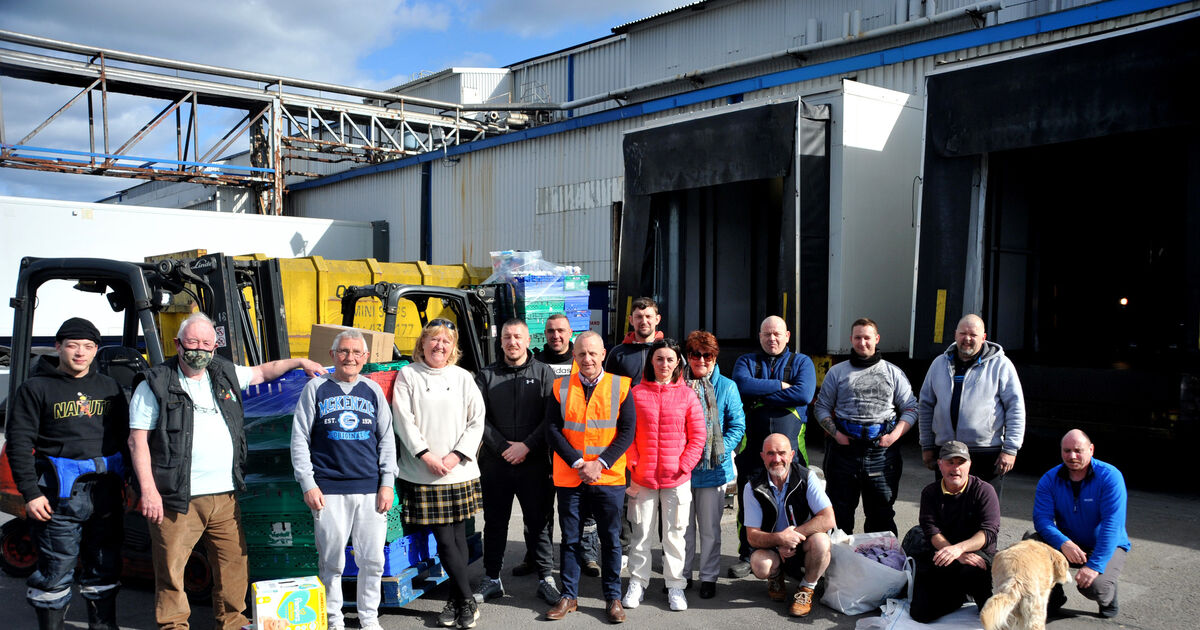 Penny Dinners co-ordinator Caitríona Twomey with volunteers and staff at CGI Food Park, Knockgriffin, Midleton, Co Cork. CGI Food Park has supplied a bay where trucks can be loaded and volunteers were getting the supplies ready for delivery to villages in Poland, train stations, the border crossing at Medyka, and Ukraine hospitals. Pictures: Larry Cummins