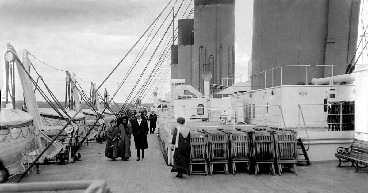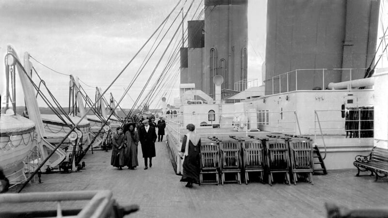 Picture shows passengers strolling along the deck of the doomed liner off Roches Point.