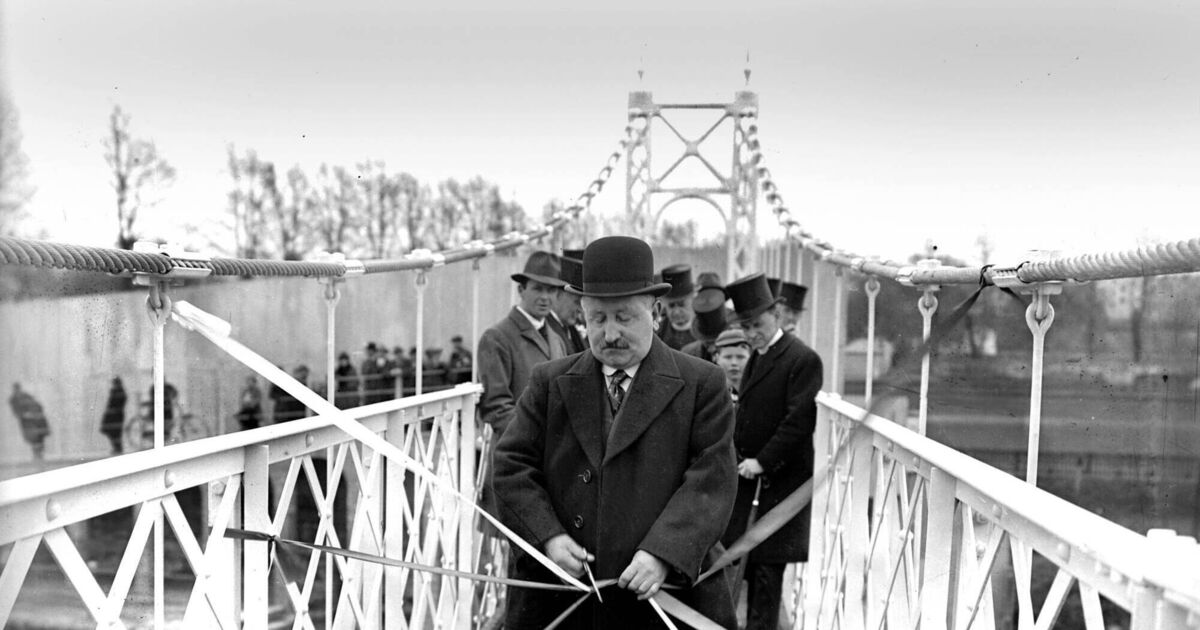 Peace Commissioner Mr M. O'Driscoll officially opening Daly's Bridge (otherwise known as the 'Shakey' Bridge) at Sunday's Well in 1927.